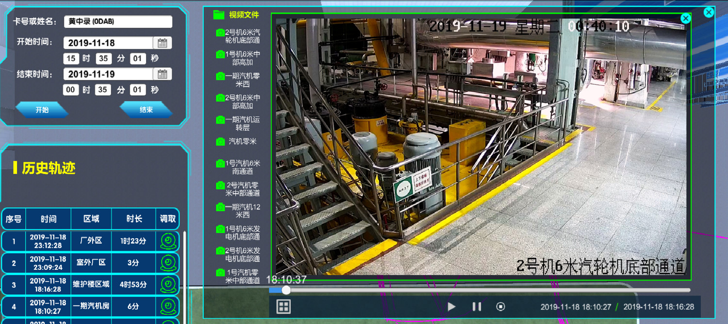 系統(tǒng)支持接入電廠視頻監(jiān)控系統(tǒng),在三維電子地圖上顯示視頻監(jiān)控位置,任意切換調(diào)取視頻監(jiān)控。可實(shí)現(xiàn)快速查找、單點(diǎn)回放、圖像識別等功能。同時(shí)可基于人員當(dāng)前位置自動(dòng)調(diào)取對應(yīng)的視頻監(jiān)控,對人員行走到其他位置自動(dòng)切換到相應(yīng)監(jiān)控畫面。對于發(fā)生異常的情況,可基于人員歷史軌跡不同位置及不同時(shí)段調(diào)取相應(yīng)位置相應(yīng)時(shí)間段的歷史視頻監(jiān)控,與歷史軌跡聯(lián)動(dòng)播放,方便事故分析及責(zé)任劃定。