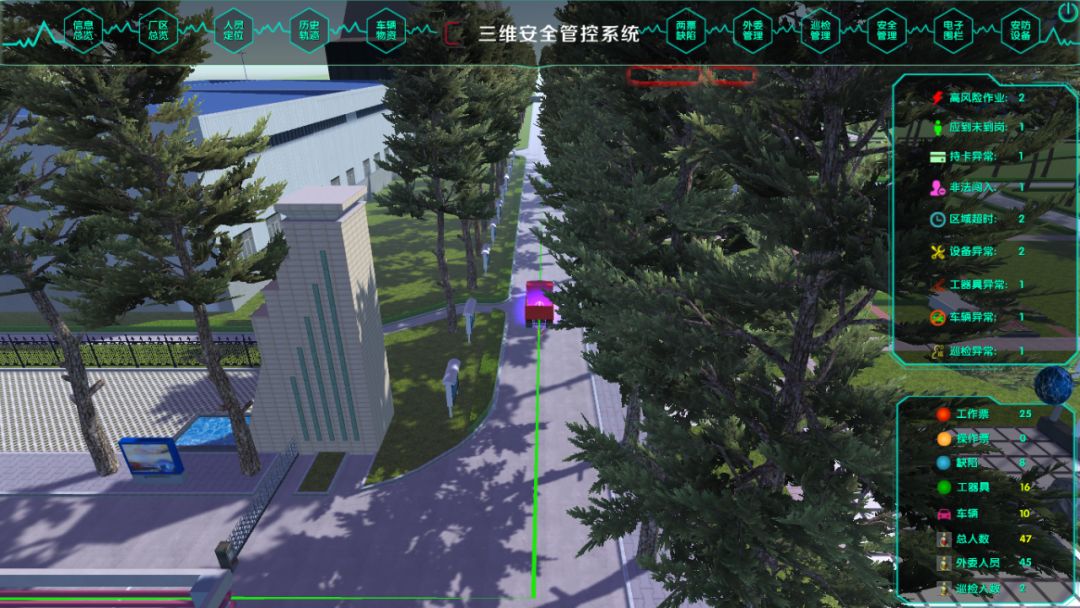 進出廠區(qū)的運送固廢車輛,?;奋囕v、外來車輛、重型機械等安裝GPS定位。在系統(tǒng)中為車輛預設固定路線,并通過GPS進行追蹤,實現(xiàn)各類車輛的實時位置監(jiān)督、跟蹤其行駛軌跡,一旦發(fā)現(xiàn)偏離預設路線立即報警并推送相關管理人員。
